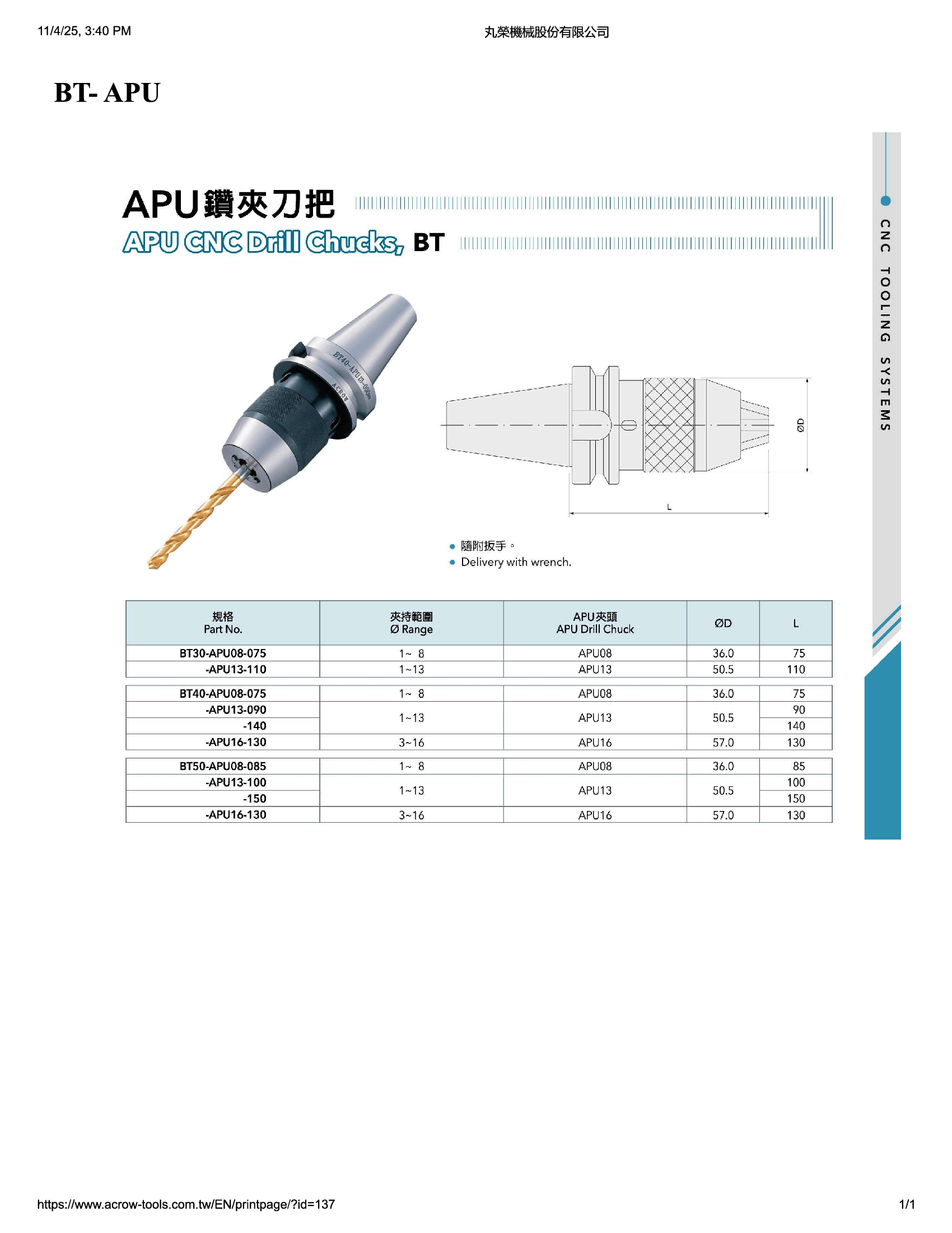 The Acrow BT50-APU13-150 is a long-reach APU13 integrated CNC drill chuck designed for applications requiring increased projection and deeper drilling access. Its 150 mm projection provides enhanced clearance over fixtures while maintaining rigidity, concentricity, and stability. Built from hardened alloy steel and precision-ground, this holder offers excellent gripping strength, low run-out, and reliable performance on BT50 spindle CNC machining centers.