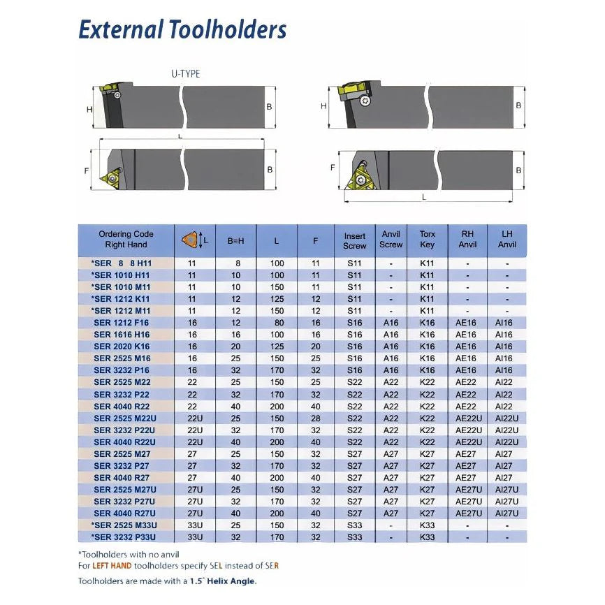The Carmex SER 4040 R27 is a high-precision external thread turning toolholder designed for use with Carmex 27 ER series threading inserts. Engineered from premium alloy steel for maximum rigidity and stability, it ensures outstanding accuracy and repeatability in all external threading operations. This right-hand U-Type holder features a 40 mm shank and a standard 1.5° helix angle, offering secure clamping, excellent chip evacuation, and long-term durability in demanding machining environments.