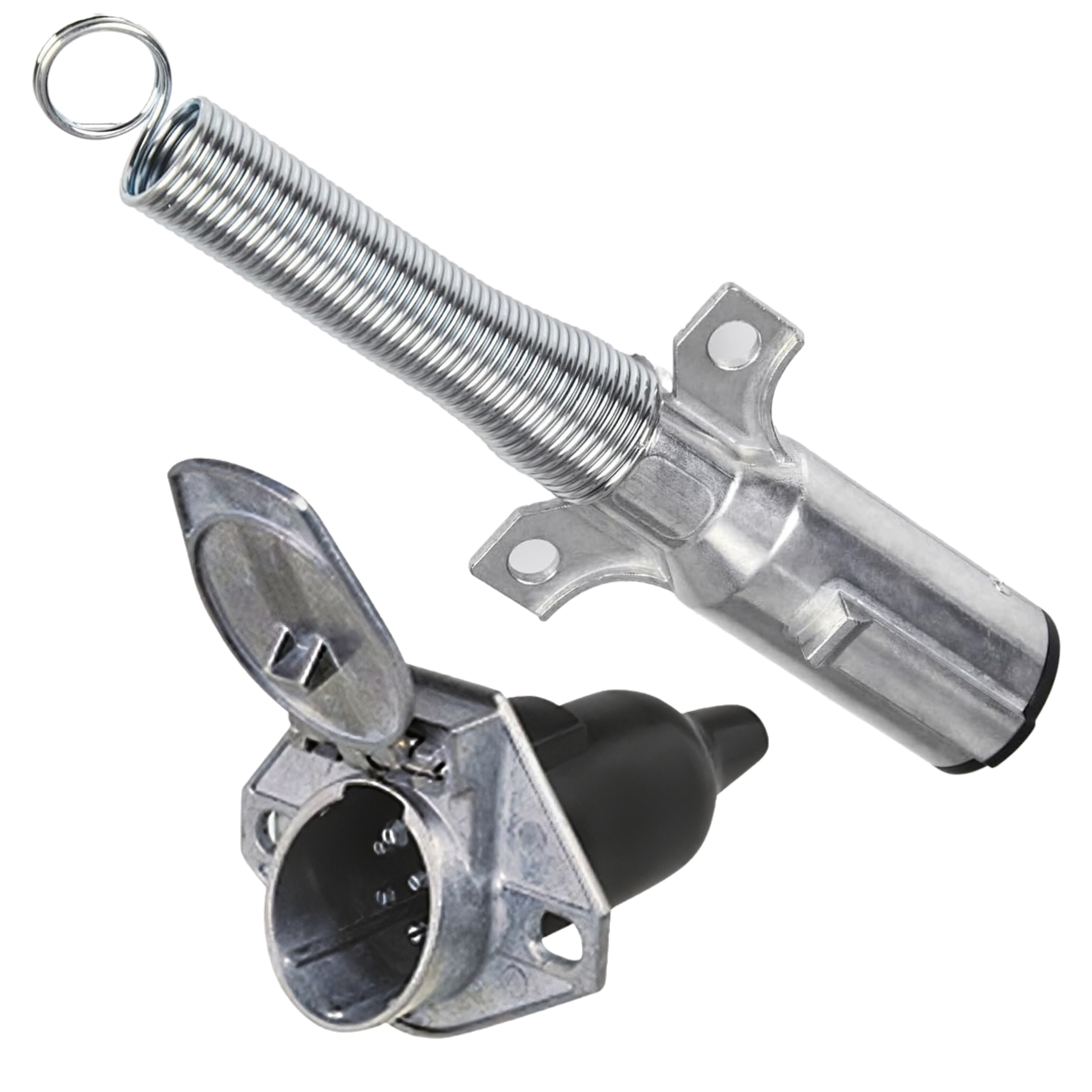 Heavy-Duty 7-Pin Round Trailer Plug & Socket Set – Die-Cast Zinc with Rubber Boot & Spring Mount This 7-Pin Round Trailer Connection Set includes both the vehicle-side socket and trailer-side...
