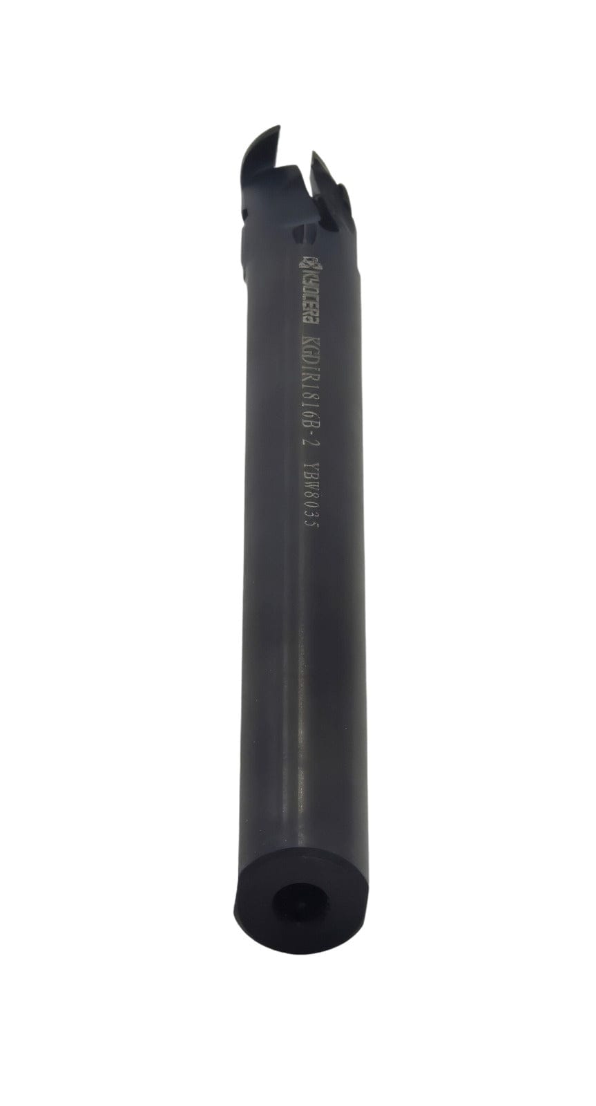 The Kyocera KDIR1816B-2 is a precision turning and grooving toolholder designed for demanding external groove and cut-off operations. With a minimum bore diameter of 18 mm and a shank diameter (DCON) of 16.0 mm, this right-handed holder supports a grooving width of 2 mm and a grooving depth of 4.5 mm. It features internal coolant for improved chip evacuation and durability, a total length (OAL) of 150.0 mm, and a head length (LH) of 25 mm, delivering stability and reach in tight applications.