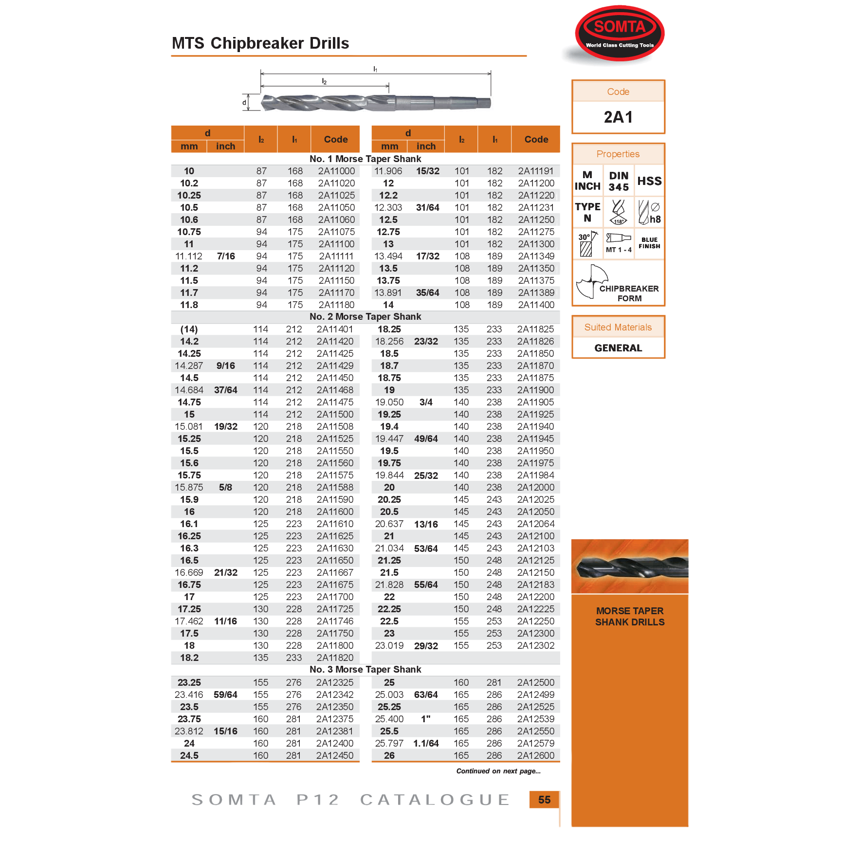 The SOMTA 2A12183 is a 55/64″ High-Speed Steel Morse Taper Shank (MT2) Chipbreaker Drill designed for efficient and accurate drilling in tough materials such as steel, cast iron, and alloy metals. Featuring advanced chipbreaker flute geometry, it provides smooth chip evacuation, minimizes heat buildup, and enhances tool life — making it ideal for both production and general engineering use.