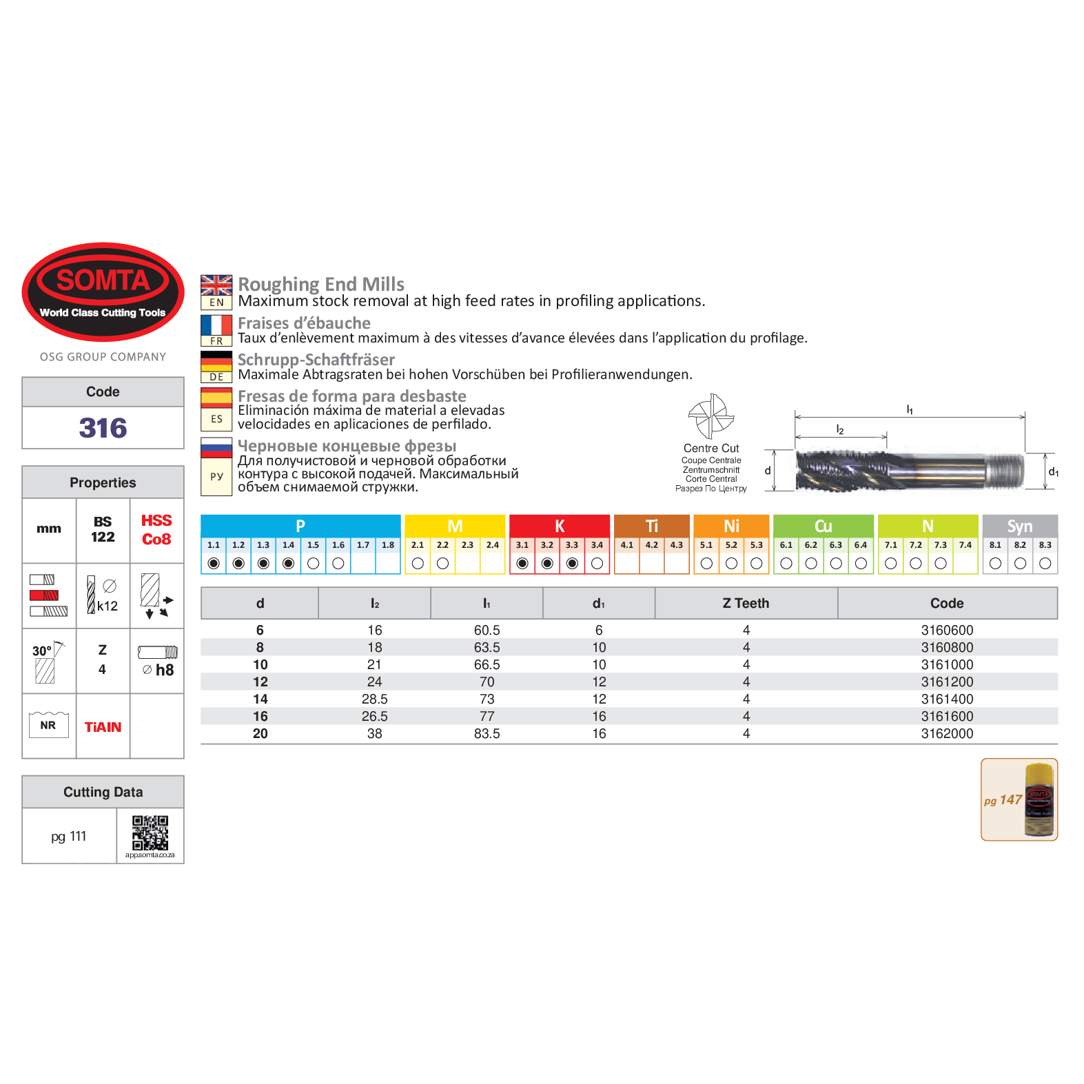 Somta Series 316 – 20.0 mm HSS-Co8 Multi-Flute Roughing End Mill | 3162000
